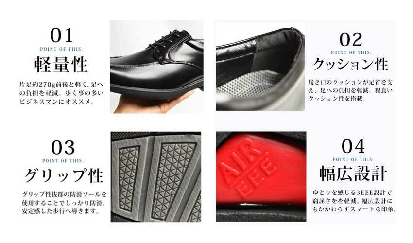 甲革は、雨や汚れに強い合成皮革、柔らかい素材で足入れがソフトです。ソールは、防滑性・屈曲性に優れた合成ゴム底で、エアクッション内蔵によりクッション性が良く足の負担を軽減します。ヒールはやや高めの3.5cmございます。ワイズ(幅)は3E(EEE)と余裕があり、超軽量設計で履きよい靴です。インナー(裏地)とインソールはメッシュで吸湿性・通気性(乾燥性)がよく、靴内を清潔に保ちます。オーソドックスなデザインで、幅広いビジネスシ-ンで活躍します。