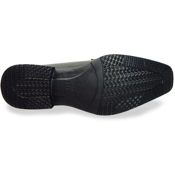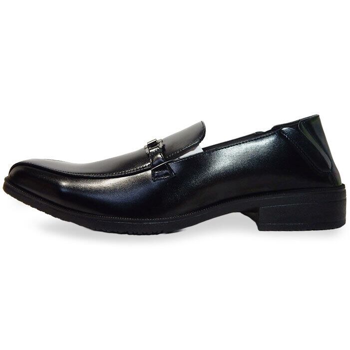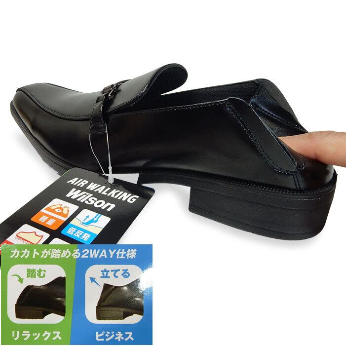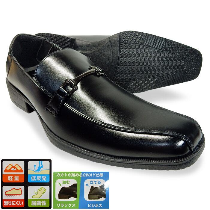 カカトが踏めて、ビジネスシューズにもビジネスサンダル(ビジネススリッパ)にもなる2Wayビジネス紳士靴。超軽量で柔らかなソールで、履き心地も抜群。ビジネスの場では通常の履き方、オフィスではかかとを踏んでサンダルのようにスリッパ感覚でお履きいただけます。(かかとはスーツの裾に隠れてしまうので、外見は通常の紳士革靴を履いているように見えます。)あらゆるビジネスシーンはもちろん、脱ぎ履きの機会が多いお仕事や職場にもおすすめです。甲革は水や汚れに強い合成皮革、ソールは軽量ラバーソールで、クッション性・グリップ性、屈曲性に大変優れています。幅(ワイズ)は3E(EEE)と余裕があり足入れがよく、裏地はメッシュで通気性と速乾性に優れ足蒸れもしにくく快適。サイズは、25.0cm(25センチ)、26.0cm(26センチ)、27.0cm(27センチ)、28.0cm(28センチ)の4種類です。